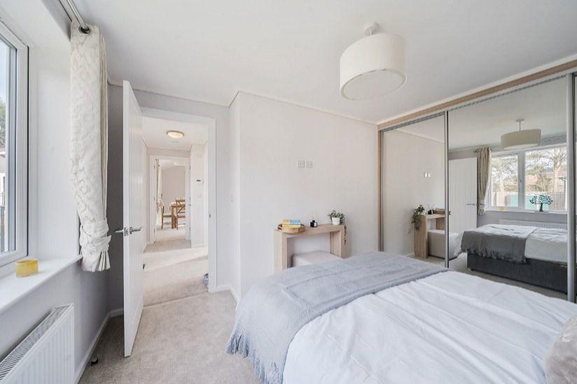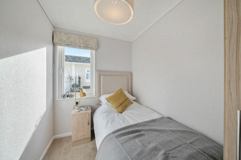 The primary bedroom is a haven of comfort, featuring a superior comfort double bed with a padded headboard, colour-coordinated curtains, and ample storage with fitted wardrobes, freestanding bedside cabinets, and a chest of drawers. A dressing table with a stool and plush carpet flooring complete this serene retreat. The secondary bedroom, perfect for family or friends, includes a single bed, colour-coordinated curtains, a fitted wardrobe, and freestanding bedside cabinets.