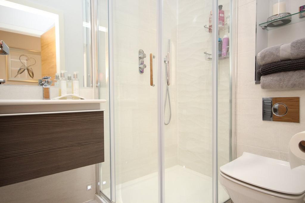 6' 1" x 4' 7" (1.85m x 1.40m) Corner shower cubicle with 'Rainfall' shower and hand held shower head, inset flush w.c., wash hand basin inset in vanity unit with cupboard under, heated towel rail, tiled walls and flooring.