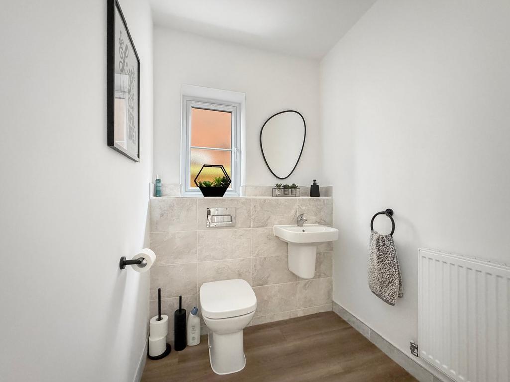 Obscure window to side, enclosed cistern WC, wall hung wash hand basin, LVT flooring, radiator.
