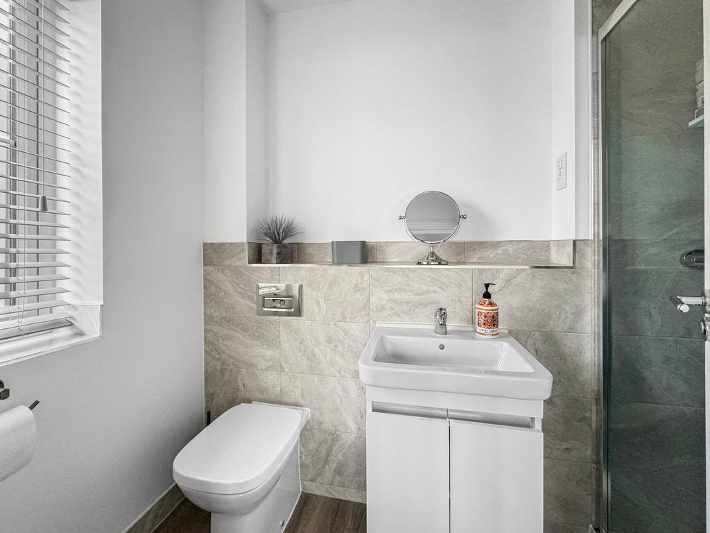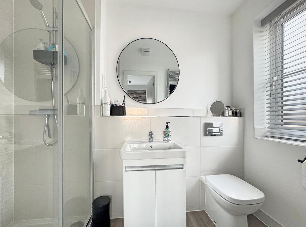 Obscure window to side, shower enclosure, enclosed cistern WC, vanity wash hand basin, heated towel rail.