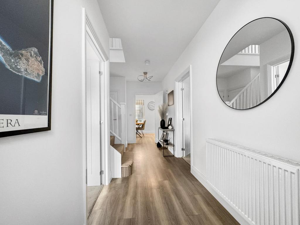 LVT flooring, radiator, stairs to first floor, storage cupboard and doors to.