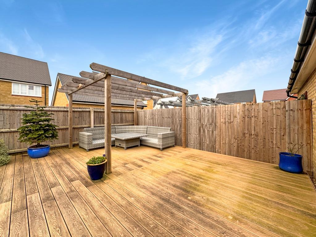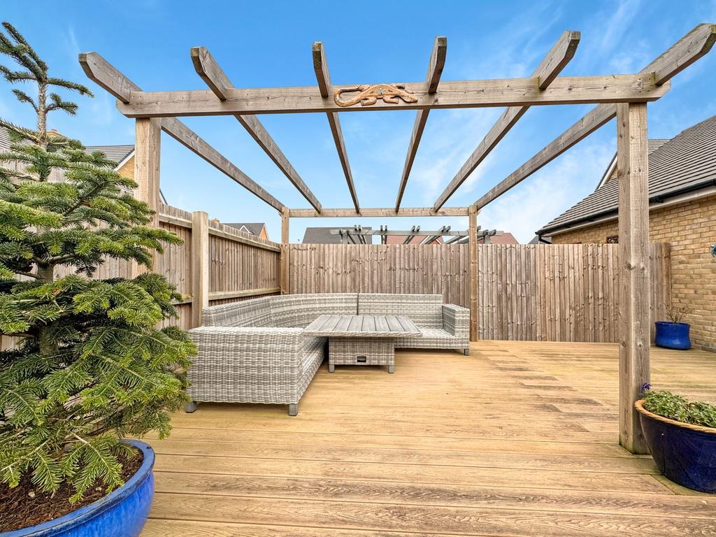 All enclosed by panel fencing with gated side access, patio area, various shrubs and plants to borders, raised composite decking area with pergola, main garden area is laid to lawn.