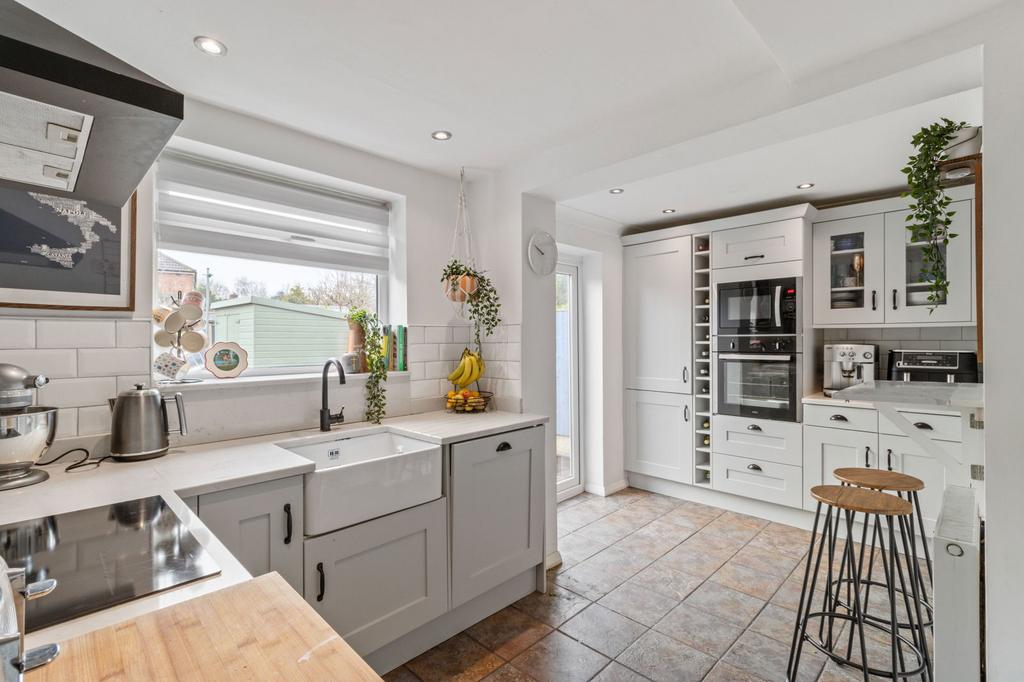 This traditional property has been thoughtfully refurbished throughout and features a generous through lounge/dining room with bay window and patio doors opening into a bright conservatory overlooking the garden. The contemporary kitchen is comprehensively fitted with quartz worktops, a Belfast sink and integrated appliances, with access to the integral garage and useful understairs pantry.