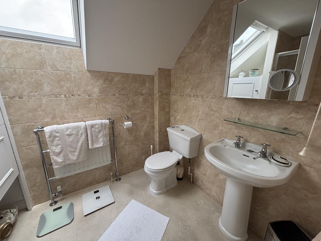 En Suite Shower Room. With shower cubicle, pedestal hand basin and low level WC. heated towel rail and double glazed window.