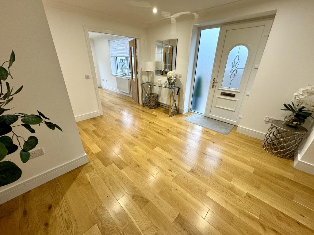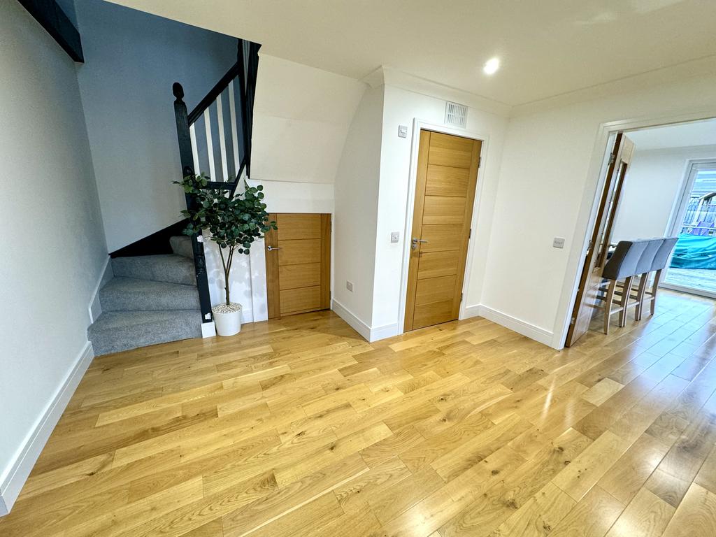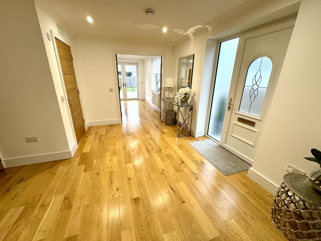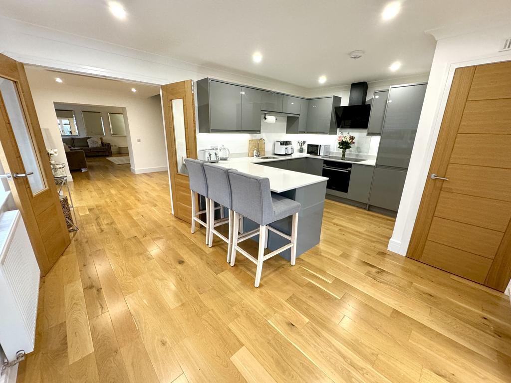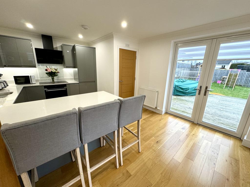 From large welcoming hallway you’ll find sizeable contemporary lounge, WC, luxurious fitted kitchen with integrated appliances and breakfast bar. With cupboards and French doors to garden.