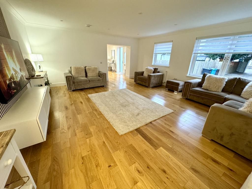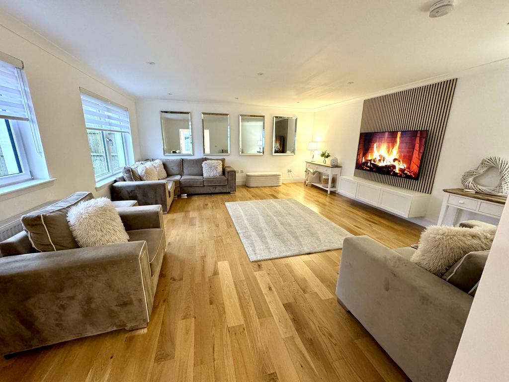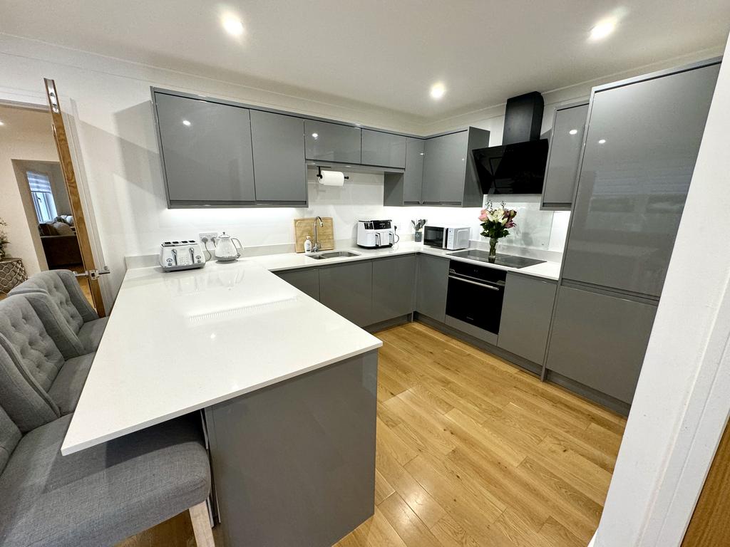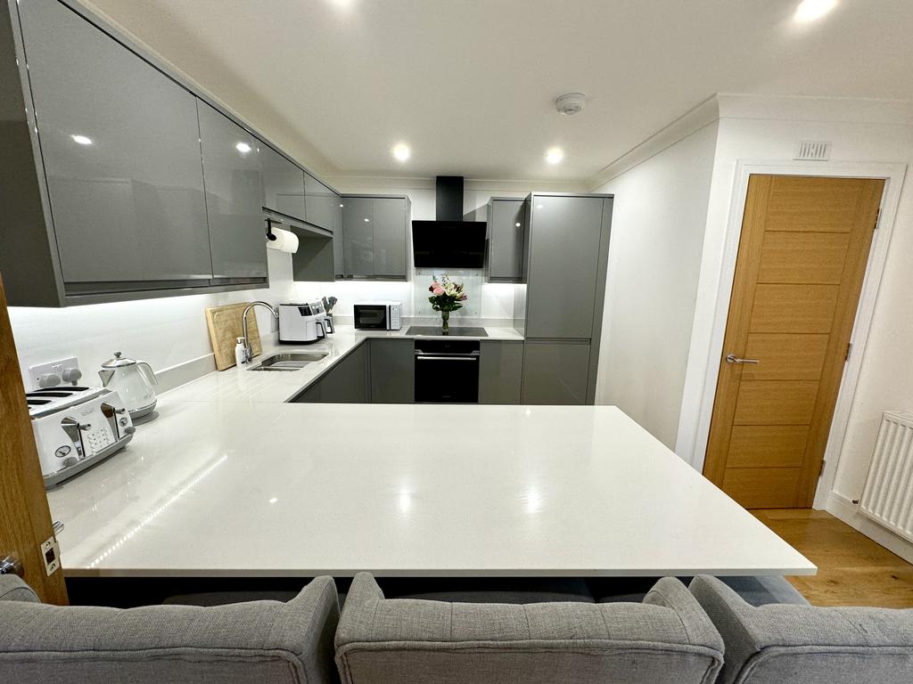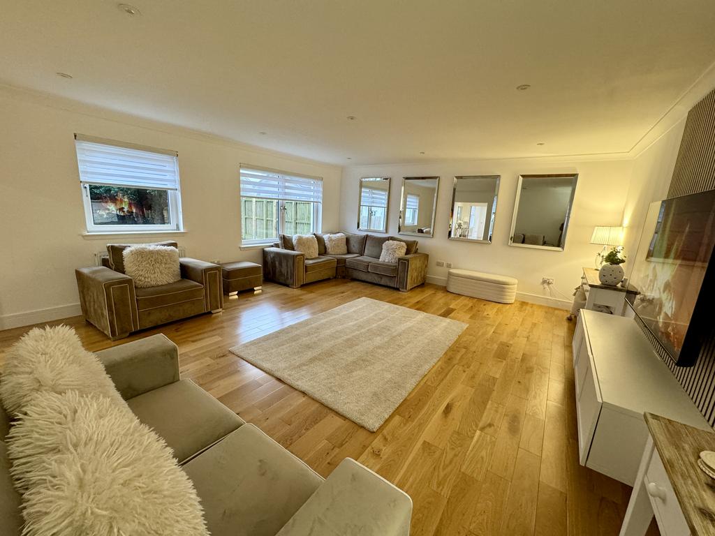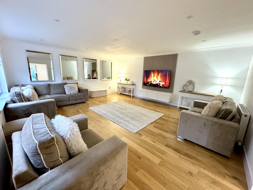 From large welcoming hallway you’ll find sizeable contemporary lounge, WC, luxurious fitted kitchen with integrated appliances and breakfast bar. With cupboards and French doors to garden.