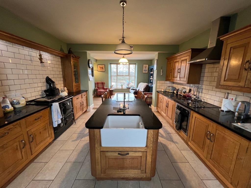 The Kitchen area has a tiled floor and a range of good quality bespoke solid Oak units comprising of base cupboards with Granite worktops, matching fitted wall cupboards, some with glazed doors, a central Island again of solid Oak construction with inset Belfast sink, Granite worktops and adjacent 6 seater Granite top fitted Dining table. Integrated New World electric oven and Belling hob unit with stainless steel cooker hood over. Integrated dishwasher. Part tiled walls. Solid fuel Rayburn cooking range which also has a back boiler connected to the central heating and domestic hot water system.