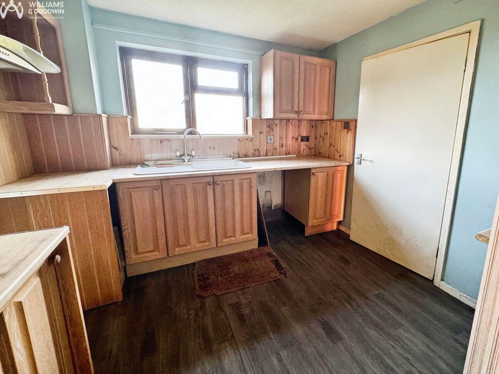 Fitted with a matching range of base and eye level units with worktop space over, sink unit with mixer tap, space for washing machine and cooker, wooden double glazed window to side, door to: