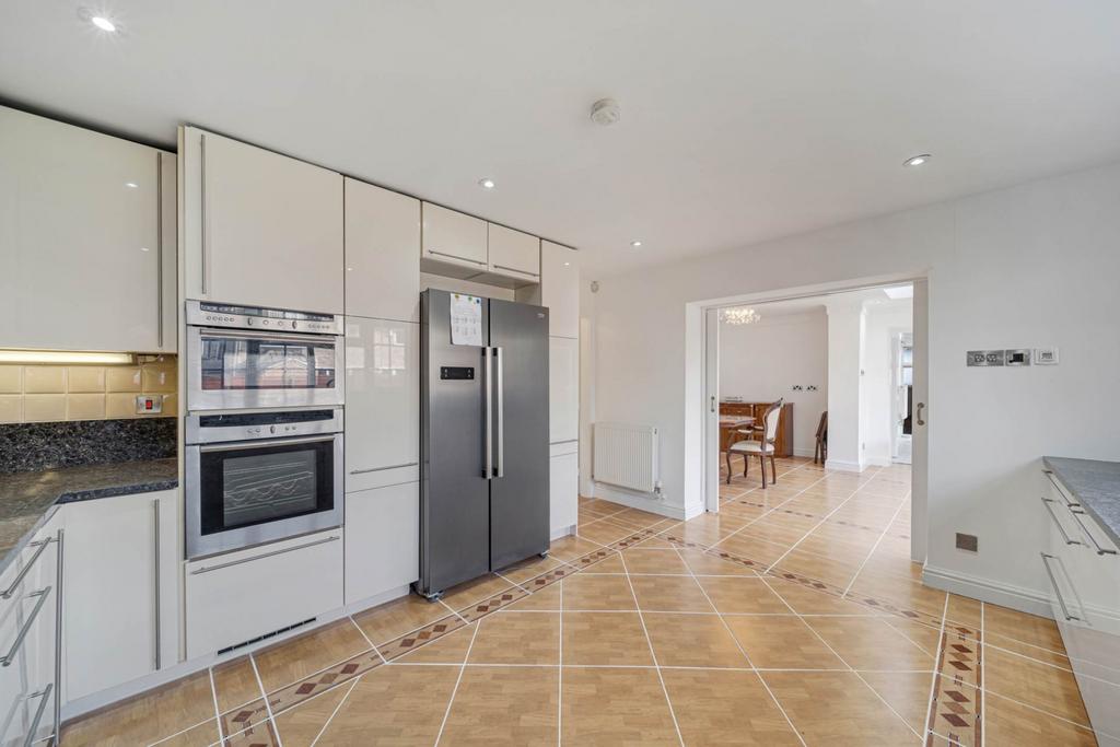 A rear facing room fitted with a collection of cream gloss fronted wall and base units with 1.5 sink unit and mixer tap, integrated oven and grill with matching five ring hob and extractor hood above. There is space for a fridge/freezer and an integrated dishwasher. Tiled floor continues through from dining room with underfloor heating. Door to:-