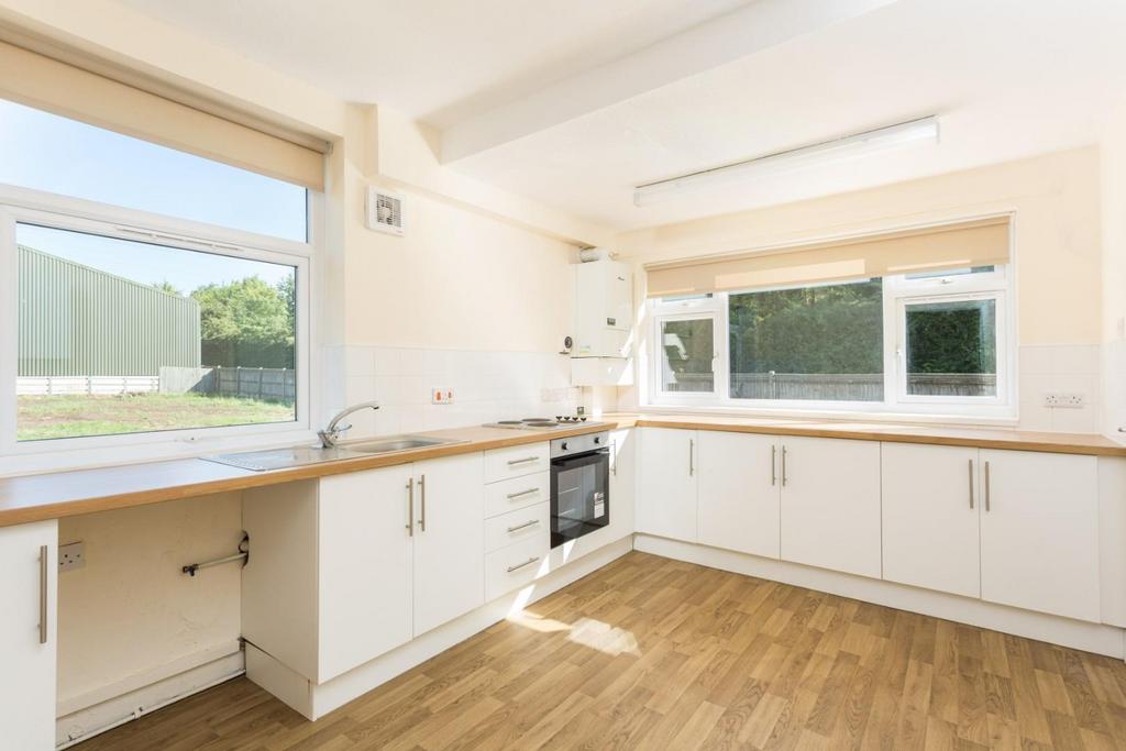Inside there is entrance porch and under stairs storage, opening through to a spacious dual aspect kitchen with garden views, integrated oven and hob, plumbing for a washing machine and space for a fridge/freezer and washer. Laminate floor and ample storage.
