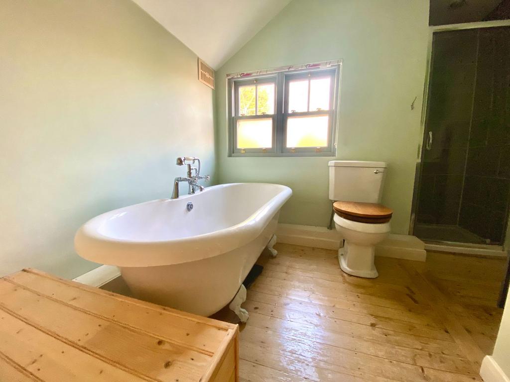 Well-appointed with a freestanding claw-foot roll-top bath with a hot and cold mixer tap and shower attachment, a shower cubicle with a mains-fed shower and tiled surround, a vanity unit with wash hand basin, WC, feature exposed floorboards, radiator, extractor, and a double-glazed window.