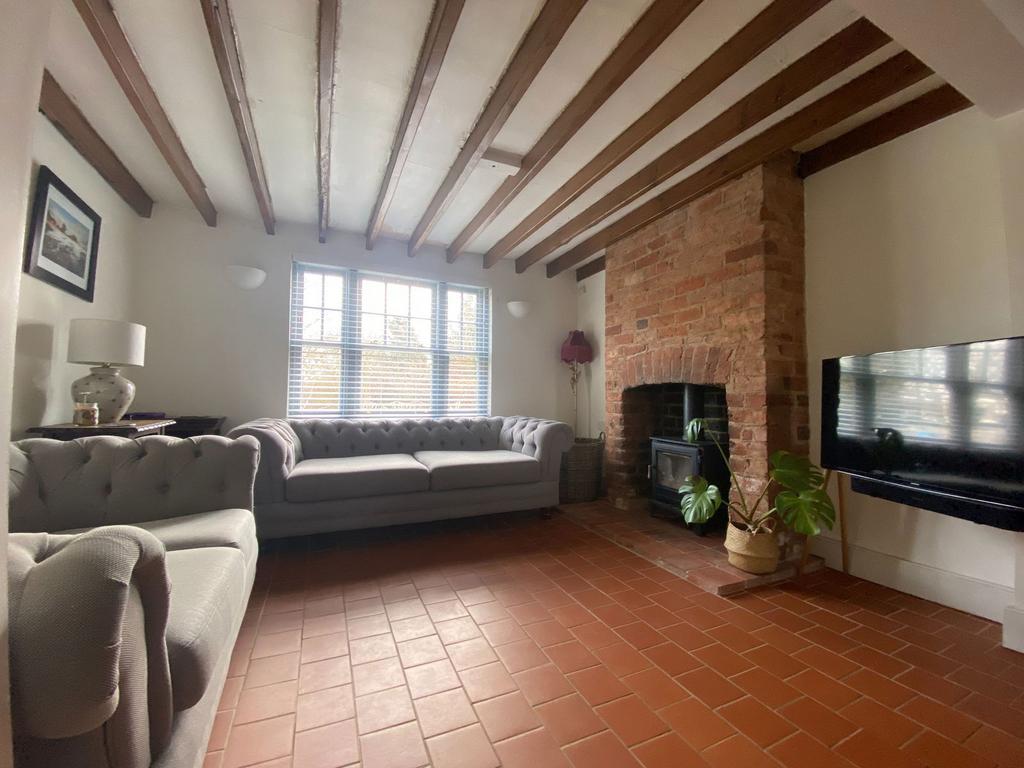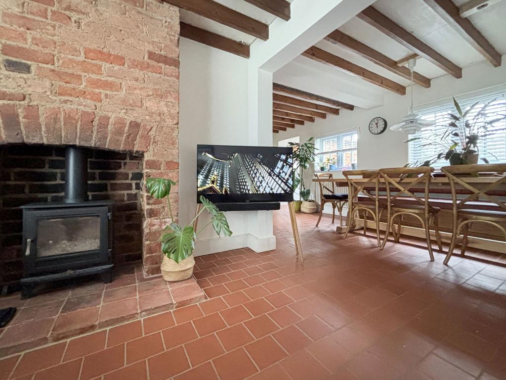 Boasts a cast iron wood burning stove with a raised tiled hearth, an original exposed brick chimney breast, original timber-beamed ceiling, quarry-tiled flooring, wall-mounted light points, a double-glazed window, and open-plan access to the dining area.