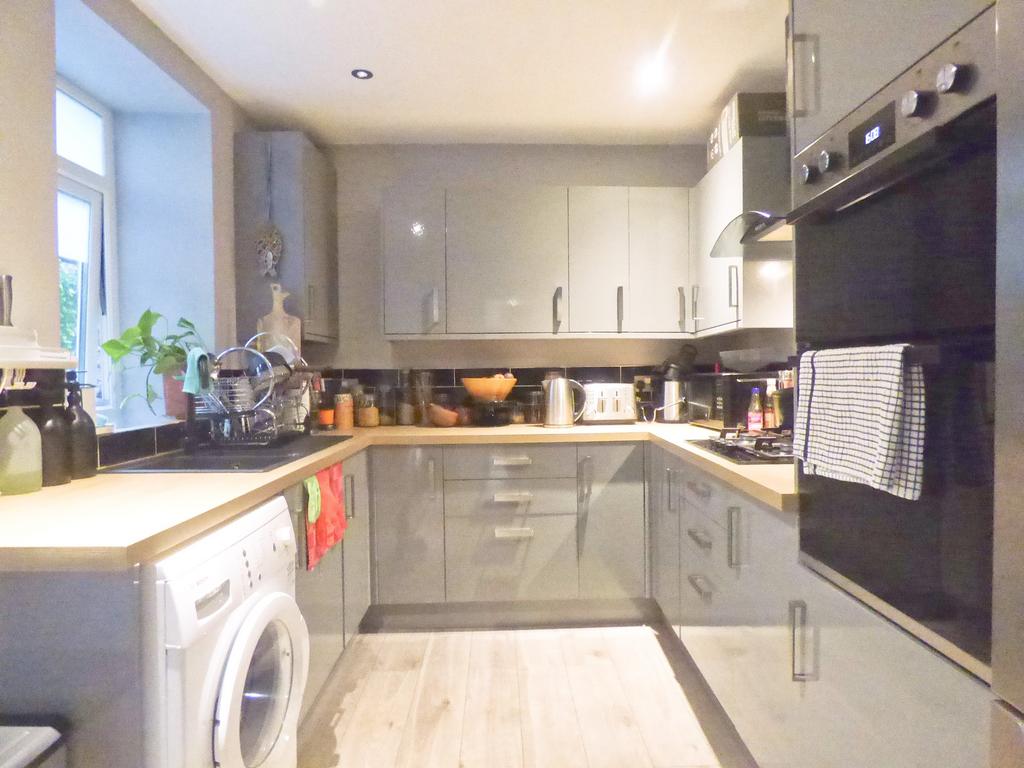 Grey gloss kitchen with wood effect worktops, one and half bowl sink and drainer with mixer tap, integrated eye-level oven and grill, gas hob, chimney extractor, space for fridge freezer, plumbing for washing machine, cupboard housing Combi boiler, laminate flooring, ceramic tile splashback, vertical radiator, various power points, spotlights, window and door to side.