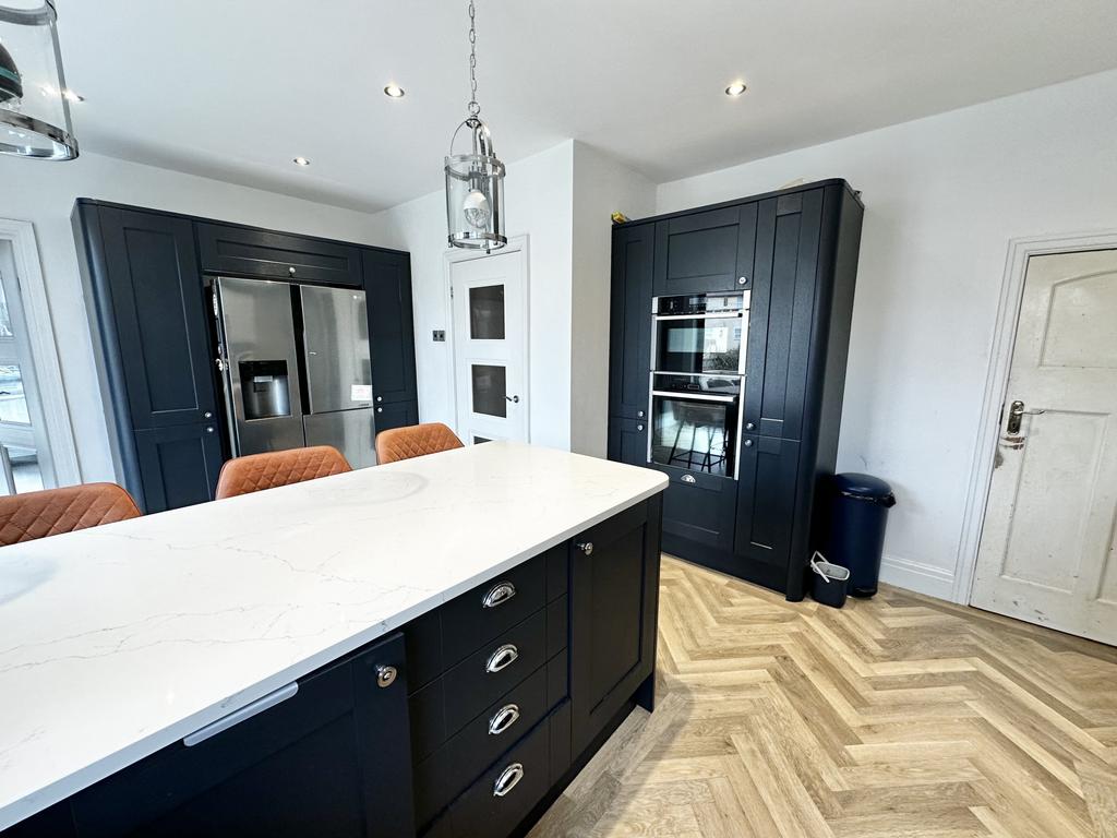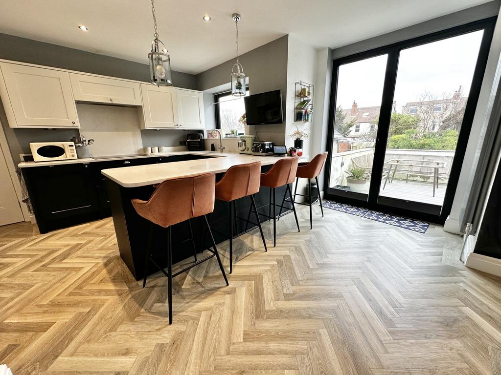 Bi fold doors to the rear aspect, a range of wall and base units with complementary work surfaces, five ring induction hob, extractor over, double oven, sink with hot tap, radiator, UPVC double glazed windows to the rear aspect, space for american style fridge freezer, side porch.