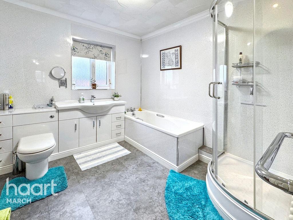 Combination toilet and vanity unit, wall mounted heated towel rail, fully enclosed shower cubicle, shaver point, double glazed frosted window to side.