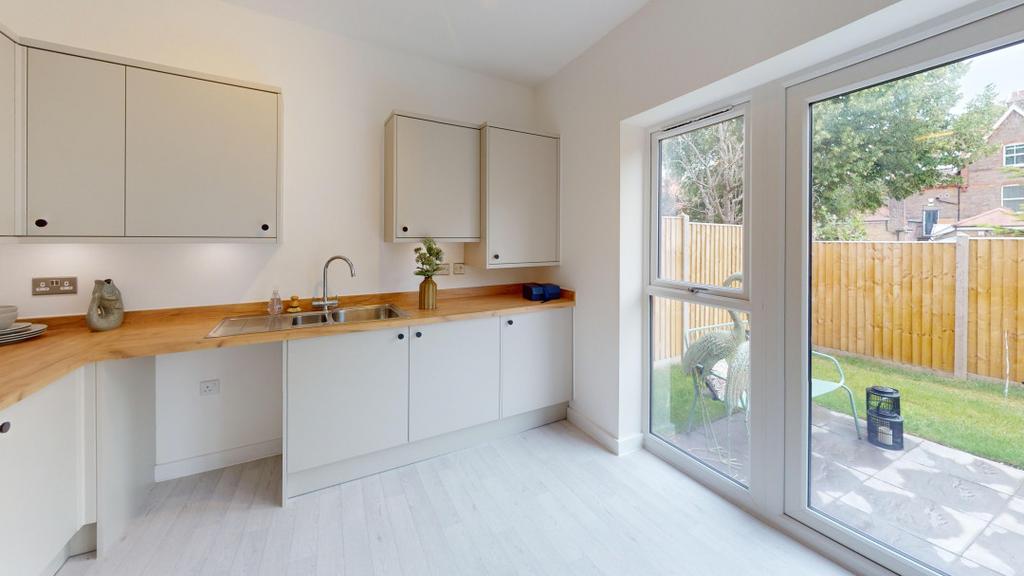The heart of the home is the open-plan kitchen, living, and dining room. The kitchen is well-equipped with fitted units, an integrated oven, hob, and extractor fan. The living and dining area is a cosy and inviting space, with room for your living room furniture and a dining table, and features a Juliette balcony, providing ample natural light.