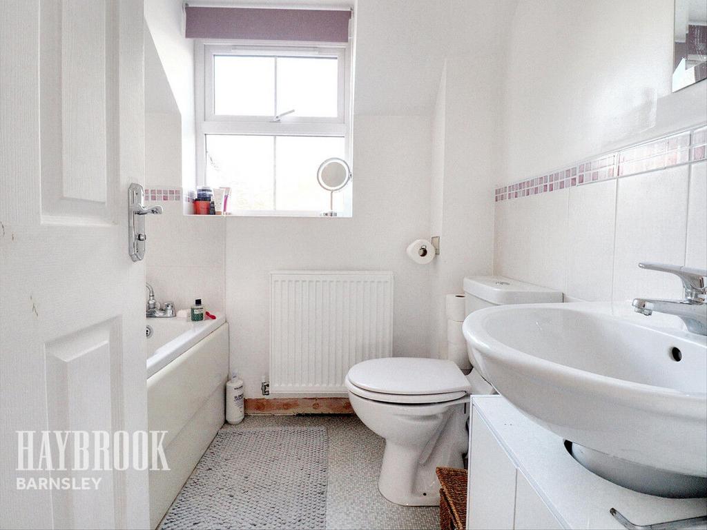 The house bathroom features a white three piece suite including a low flush WC, pedestal wash hand basin and a panel bath. Also with vinyl finished flooring, partially tiled walls, a wall mounted radiator and an elevated PVCu double glazed window.