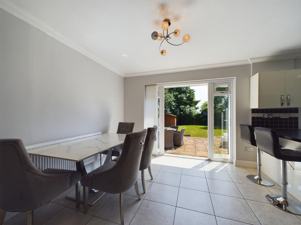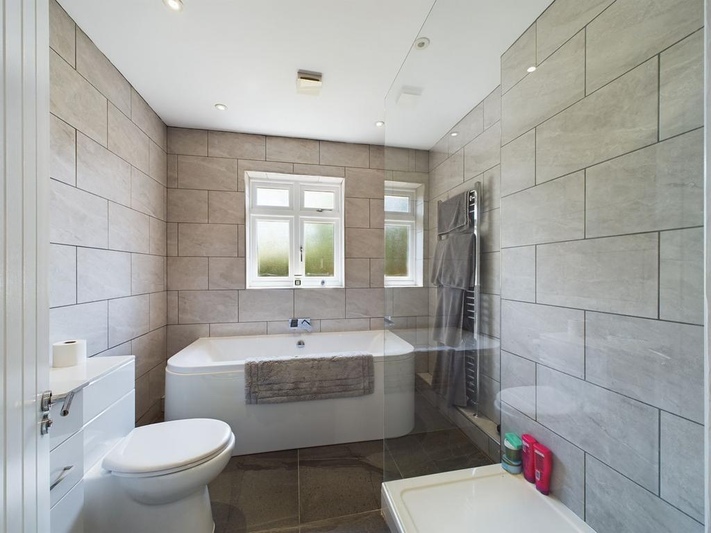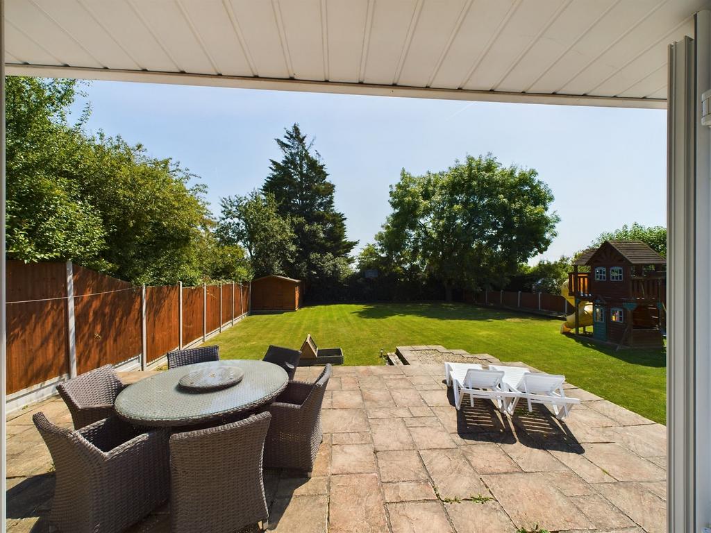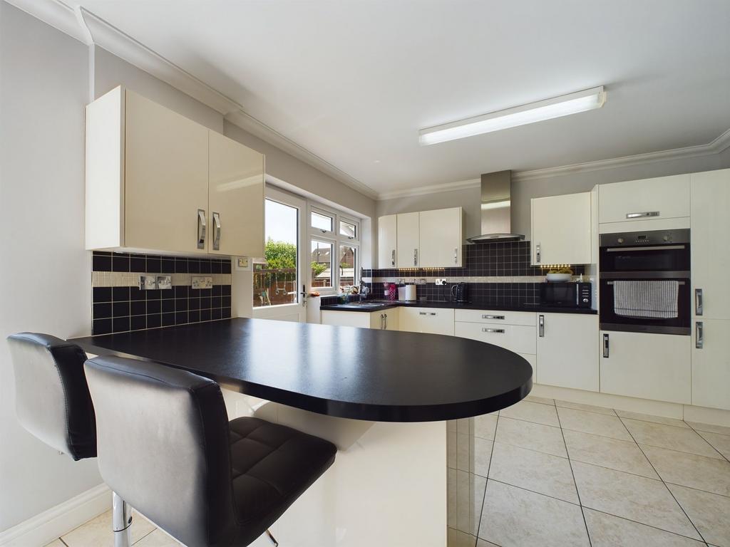 The bungalow is entered into via a feature composite door to Entrance lobby with slate tiled floor and open to L'shaped Entrance Hall with doors to the accommodation. Bedroom Two and Bedroom Three offer modern fitted wardrobes with mirror feature and wooden blinds to the windows. The master Bedroom offers a range of bespoke fitted wardrobes to one aspect and there is a good sized fourth bedroom. The fully tiled bathroom is of a good size and benefits from a modern white suite with deep panelled bath with centre mixer taps, a walk in shower with dual drench and hand held shower heads, a wash hand basin set in modern white hi-gloss unit matching cupboard and drawer unit and inset low level wc. This modern bathroom is finished with quality ceramic tiled flooring. the modern lounge with stone effect electric fire has an open aspect to the quality fitted kitchen/diner. This impressive room offers a dining area with Upvc double glazed french doors opening out to the rear garden. The kitchen is extensively fitted in modern ivory coloured base, wall mounted and full height units, with feature curved end units and contrasting work surfaces with shower mixer tap with pull out shower mixer taps. The fully fitted kitchen offers a range of integrated appliances to include: electric double oven, ceramic hob with stainless steel chimney extractor hood. Further integrated dishwasher, concealed space for washing machine and tumble drier. Modern tiled splashbacks and quality ceramic tiled flooring.