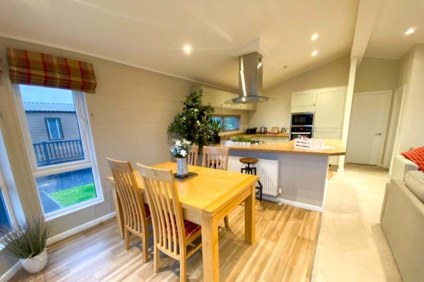 This is an incredible lodge and is the perfect Holiday Home. The large Open Plan Kitchen has integrated appliances including fridge/freezer, dishwasher, oven, microwave and wine cooler, stainless steel sink and 4-ring hob with extractor fan over. Lots of oak worktop surface space and an abundance of storage with modern wall and base units.