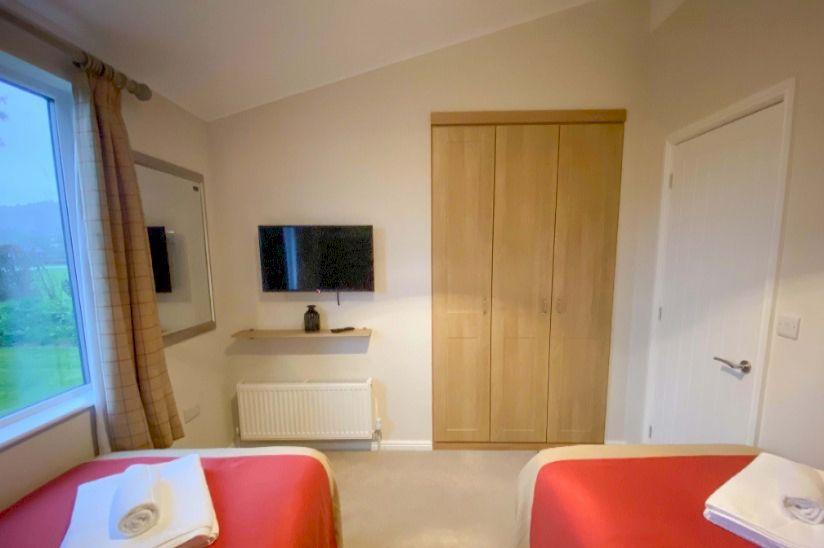 The Main Bedroom has a spacious king size bed, built-in wardrobe, and dressing area space with Large Ensuite Shower Room. The second Bedroom has 2 full sized single beds with wardrobe and cabinets. The Family Bathroom comprises a modern suite including a bath with an overhead shower and tiled walls.