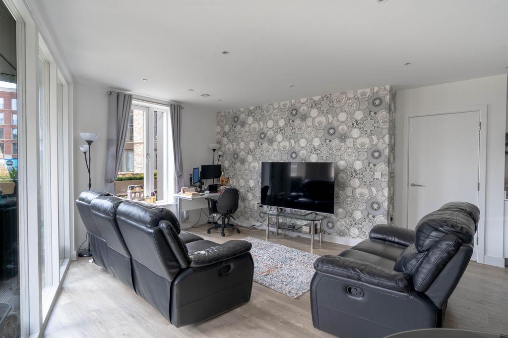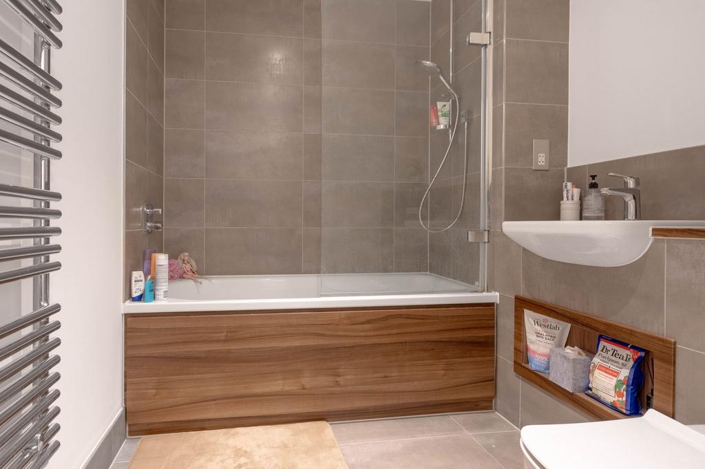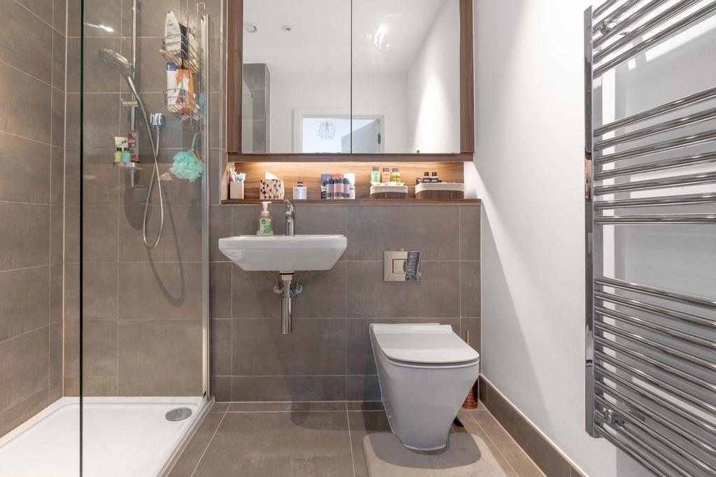 Both bedrooms are well-proportioned doubles, each with built-in wardrobes and large windows. The primary bedroom benefits from an en-suite shower room, while the main bathroom is equipped with a shower over the bath, WC, and heated towel rail. The apartment is further enhanced by underfloor heating with individual room controls and stylish wood-effect flooring throughout the main living areas.
