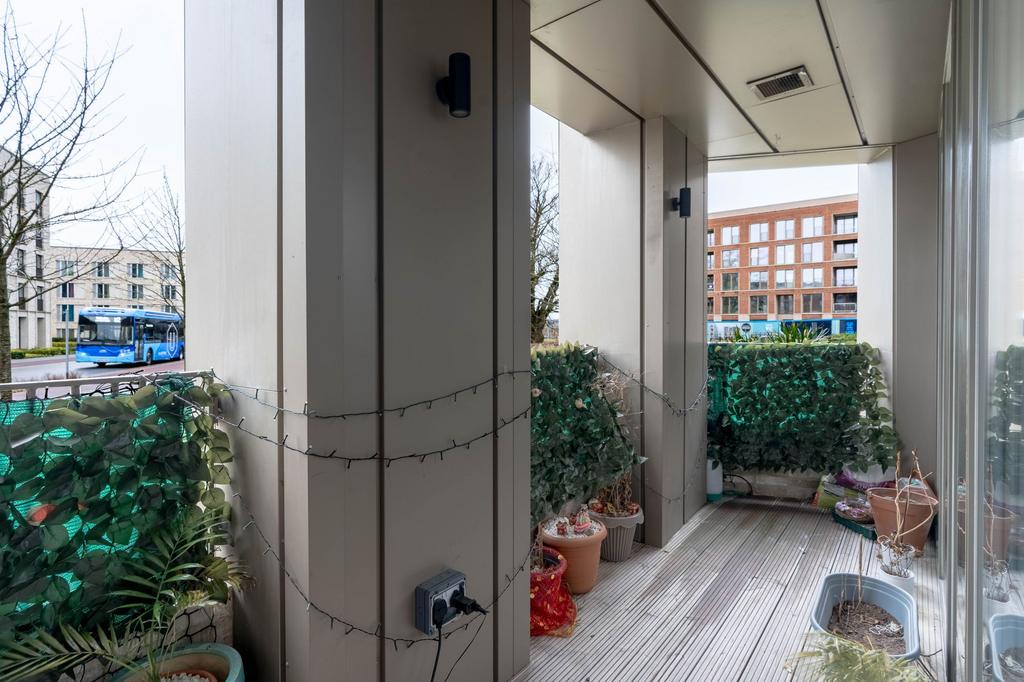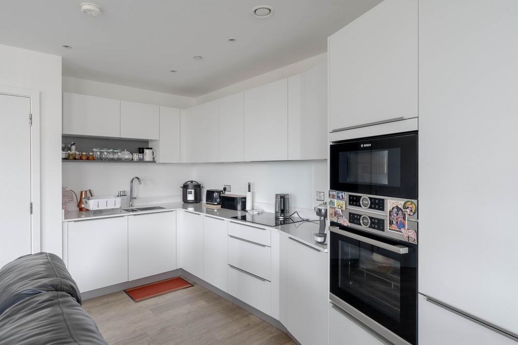 The living area is a standout feature, with expansive windows inviting in an abundance of natural light. A private balcony extends the living space, providing a useful outdoor area. The contemporary kitchen is fitted with high-quality appliances, including a Bosch oven and microwave, induction hob, extractor fan, and a Zanussi dishwasher and fridge-freezer.