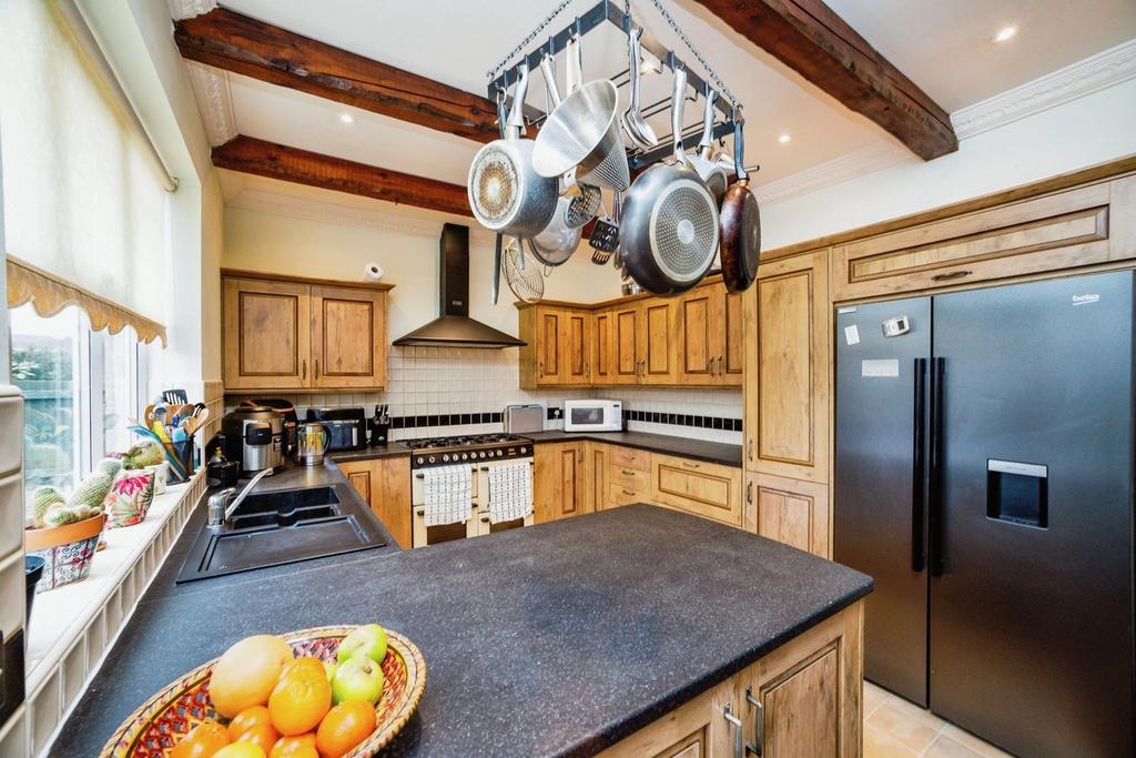 Kitchen/Dining Room - A beautifully presented kitchen and dining room offering ample space for furniture for a range of uses, with a rear aspect double glazed window, tiled flooring, the kitchen is fitted with a range of wall and base units with complimenting worktops, with tiled splashbacks, ample space and plumbing for appliances including slots for a gas range cooker and an american style fridge freezer, a one and a half inset sink with a mixer tap and drainer, exposed wooden beams, access to the conservatory, and a door providing access to the rear.