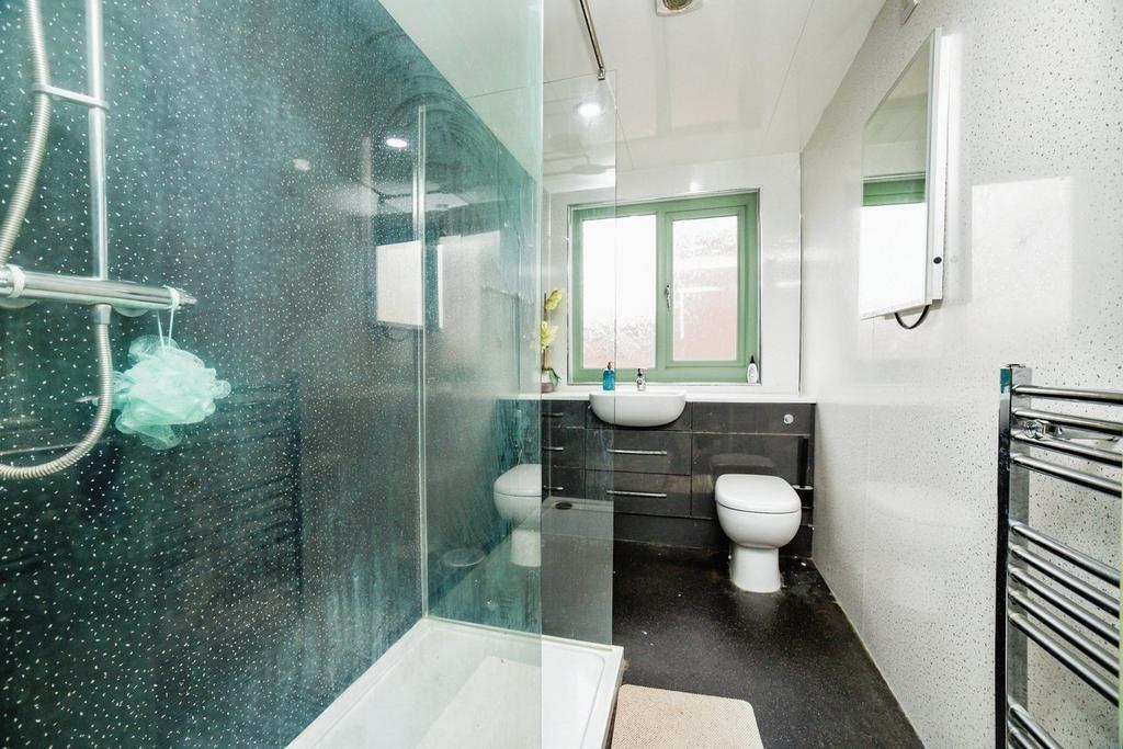 En-Suite - A three piece fitted shower room comprising of a push-button WC, a wash hand basin set into a vanity unit, a shower enclosure with glass screen doors, tiled flooring, and partially tiled walls, and an obscure side aspect double glazed window.