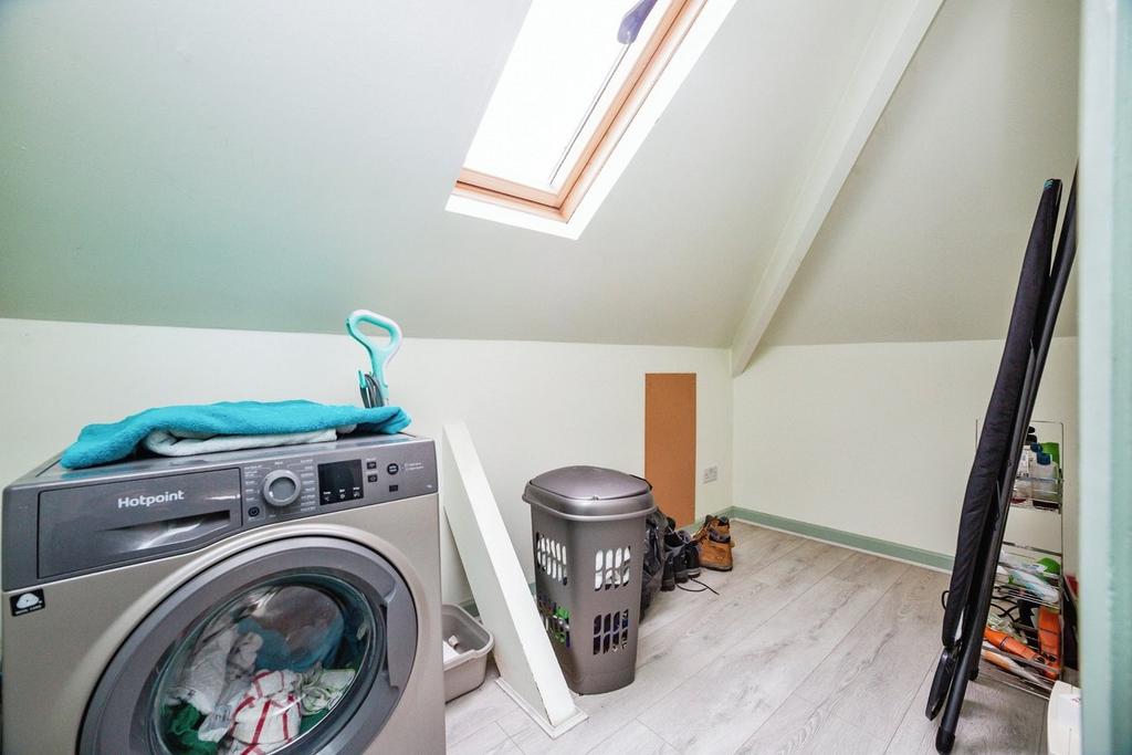 Utility Room - Offering space and plumbing for appliances including a washing machine and tumble dryer, with a double glazed skylight, and laminate flooring.