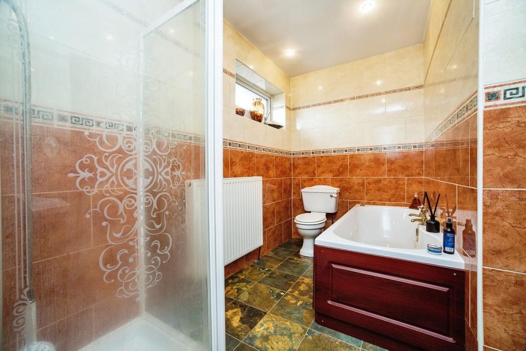 Bathroom - A four piece fitted bathroom comprising of a low-level WC, a wash hand basin with a mirror overhead, a shower enclosure for glass screen doors, a panelled bath, tiled flooring, and fully tiled walls, and an obscure side aspect double.