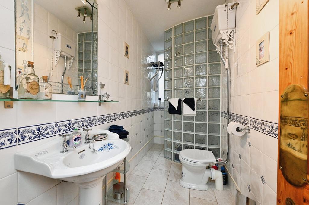 Bathroom - A three piece fitted bathroom comprising of a low-level WC, a wash hand basin, a panelled bath, tiled flooring, and partially tiled walls, and an obscure sash window.