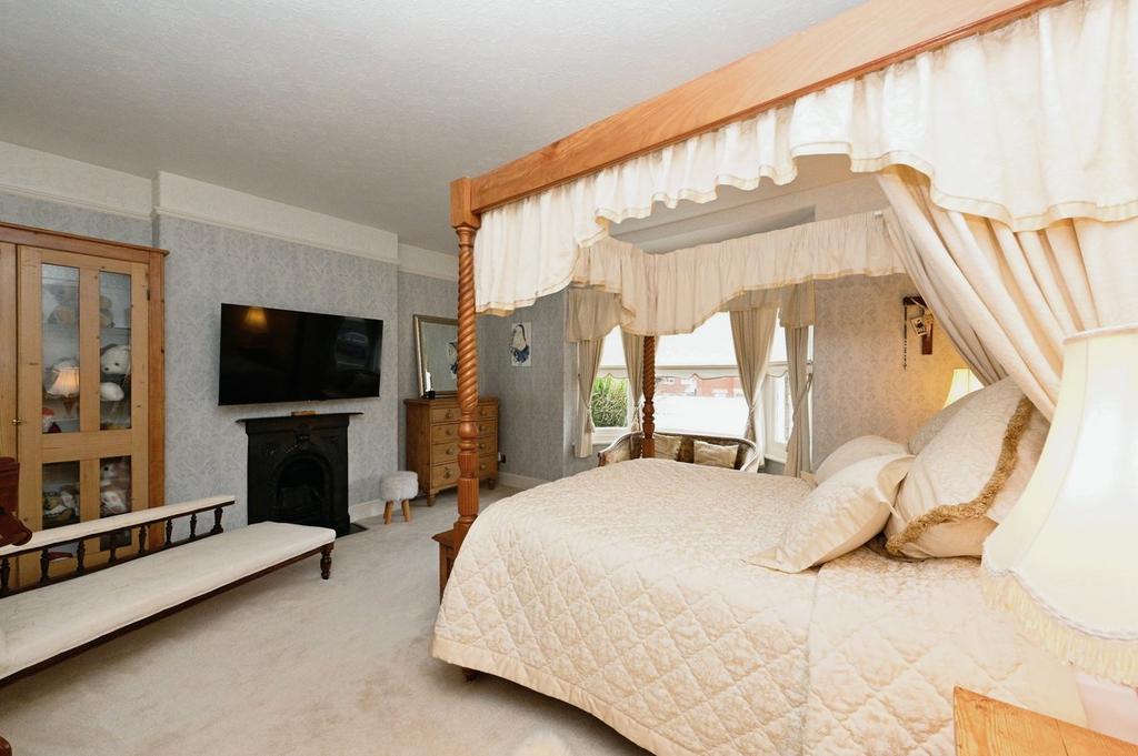 Bedroom One - A larger than average double sized bedroom with a front asepct double glazed bay window, carpeted flooring, a feature cast iron fireplace, and a door leading to the walk-in wardrobe.