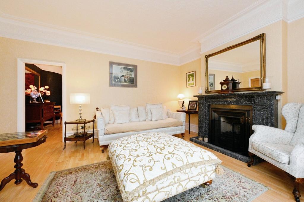 Sitting Room - A large room offering generous space for furniture for a range of uses, with two front aspect sash windows, wooden flooring, and an original fireplace with a decorative marble surround.