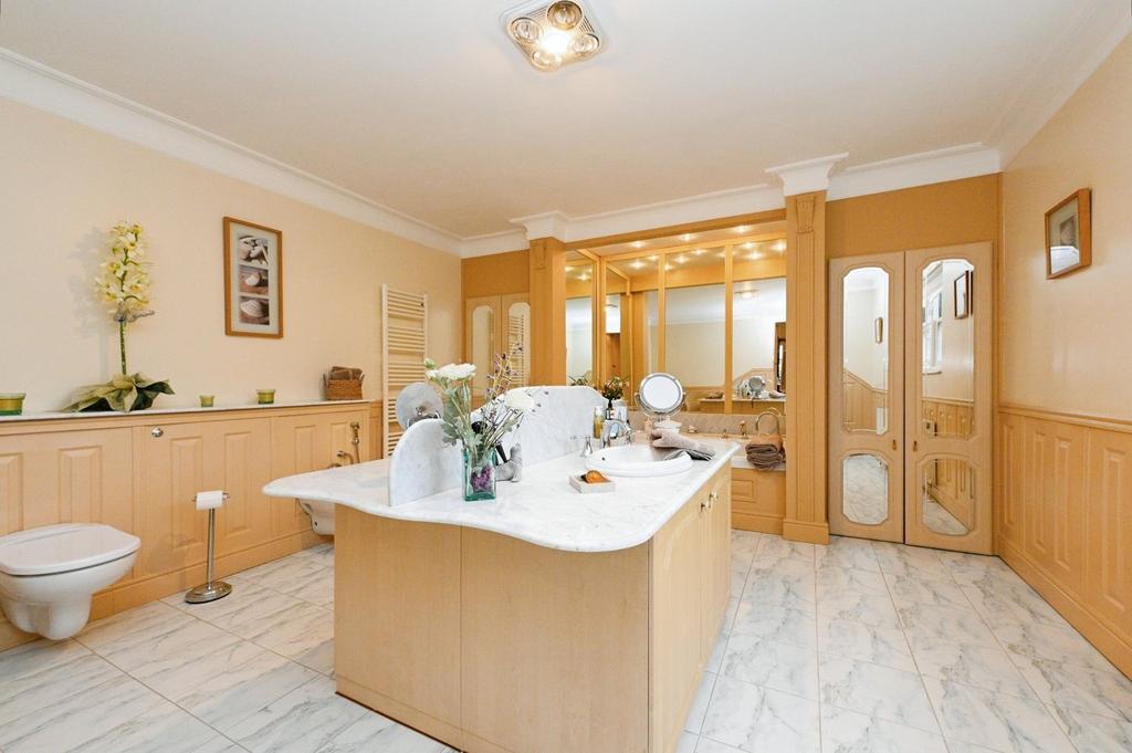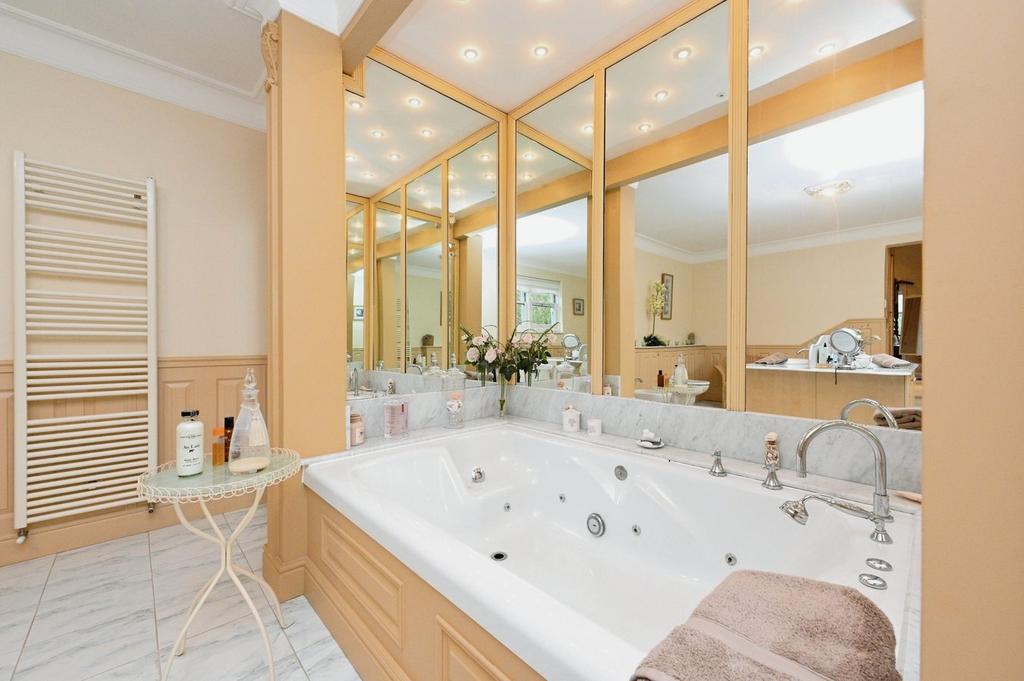 En-Suite - A beautifully presented en-suite bathroom comprising of a low-level WC, a fitted central island with built in his and hers sinks with storage cupboards underneath, a Jacuzzi v=bath with marble edging, and fully mirrored sides, tiled flooring, and two sash windows.