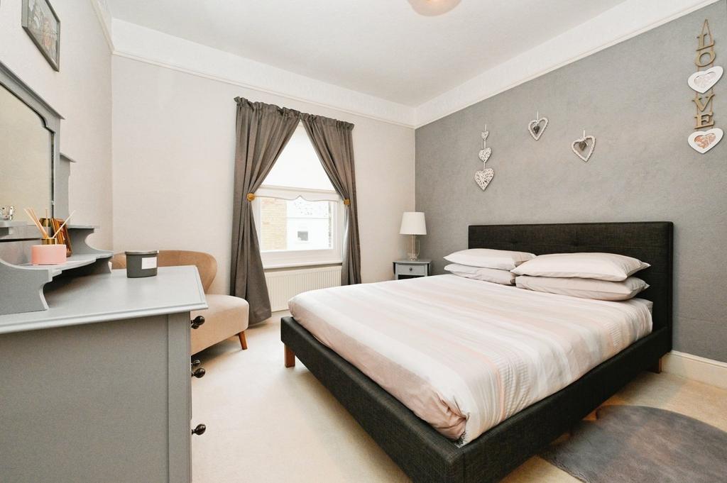 Bedroom Two - A large double sized bedroom with a front aspect sash window, carpeted flooring, and a feature cast iron fireplace.