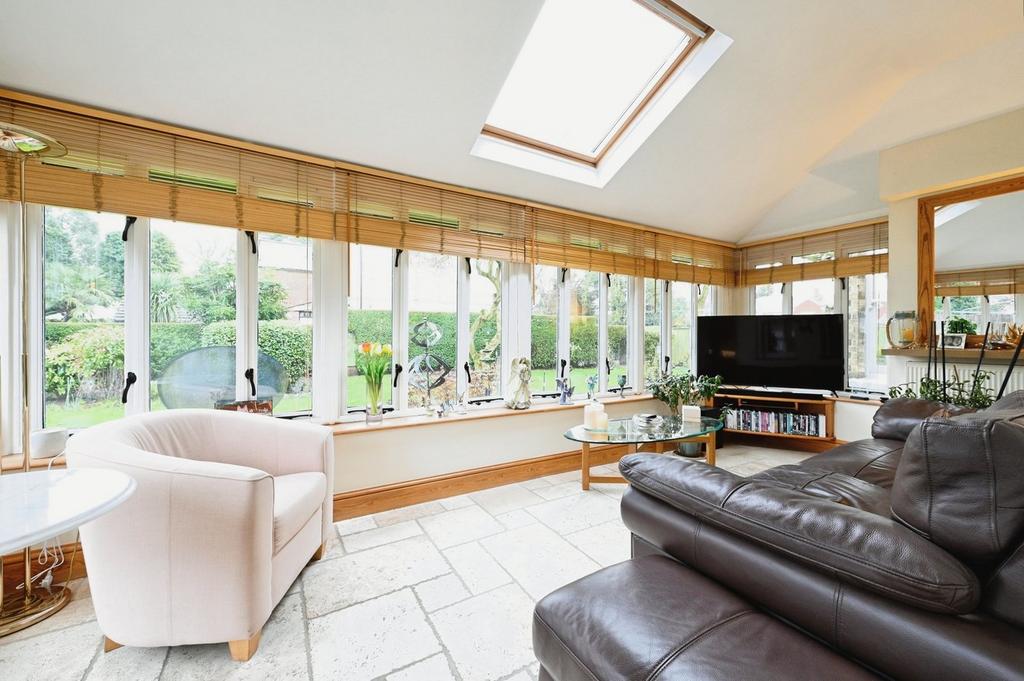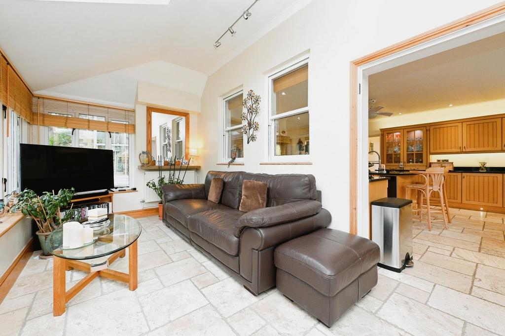 Garden Room - A bright and spacious room offering generous space for furniture for a range of uses, with both rear and roof fitted windows providing ample natural light, traverine stone flooring, and french patio doors providing access to the rear.