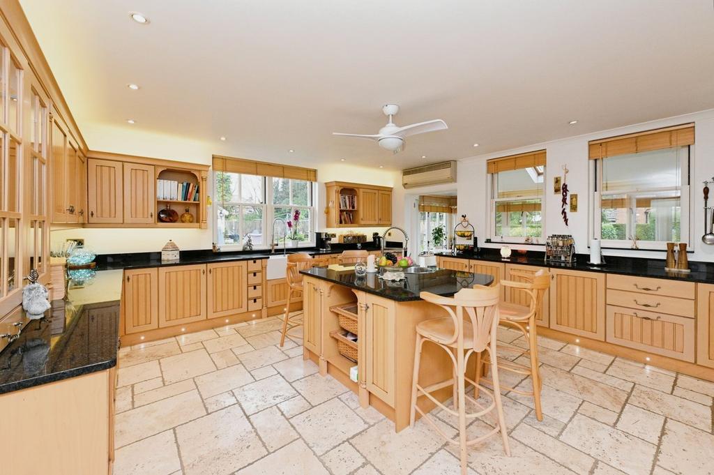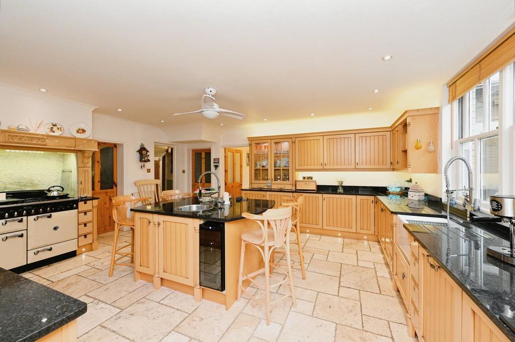 Kitchen - A beautifully presented kitchen fitted with a range of wall and base units with complimenting worktops, with two rear aspect sash windows, travertine stone flooring, With some integrated appliances and further space and plumbing for additional appliances including a slot for a gas range cooker, a belfast inset sink with mixer tap and drainer, a matching central island with an additional inset sink, and breakfast bar, and doors leading to the wine cellar, utility room, and the garden room.