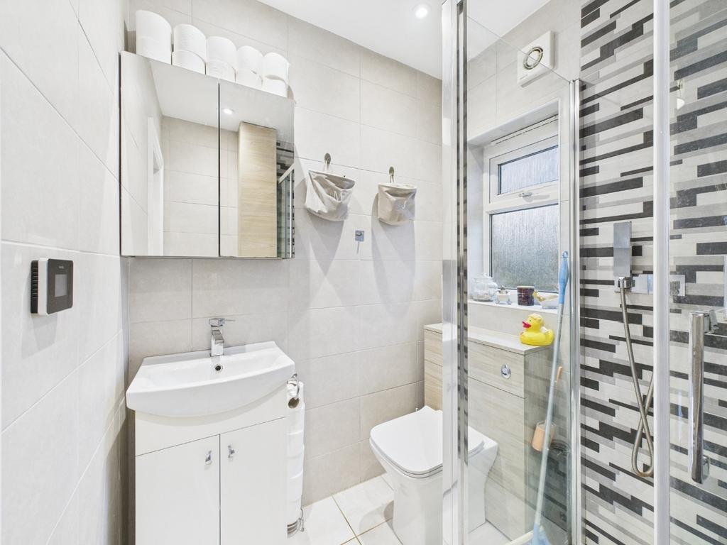uPVC frosted double glazed window to rear elevation. Radiator. Three piece suite comprising walk in shower cubicle, vanity wash hand basin and low level WC. Extractor fan. Underfloor heating. Built in speakers. Smart Warmup thermostat.