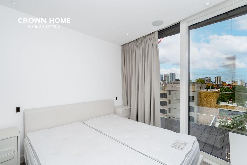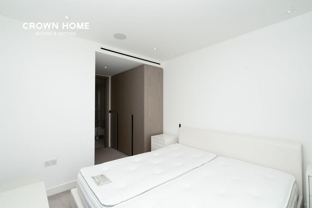 Spacious and filled with light, the living room is highlighted by floor-to-ceiling wrap-around windows offering views of Canary Wharf. The living area is perfectly sectioned, featuring a roomy dining space with timber flooring and an open-plan, fully-fitted kitchen equipped with Gaggenau integrated appliances and has a great kitchen island.