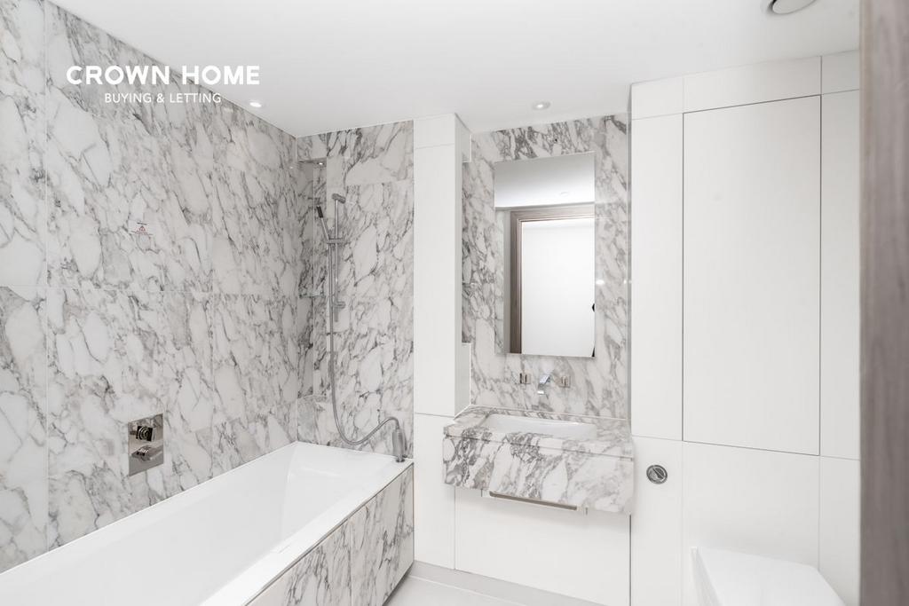Stylishly finished, the main bedroom serves as a perfect retreat for relaxation. Custom-fitted wardrobes ensure ample storage, while floor-to-ceiling windows fill the room with natural light and provide access to the balcony. Additionally, fully integrated speakers are included in main bedroom and the ensuite bathroom, providing an immersive experience. Offering a spa-like atmosphere, the family bathroom features marble walls and floors, high-quality white goods, luxury polished nickel taps, bathtub, and large mirrors.