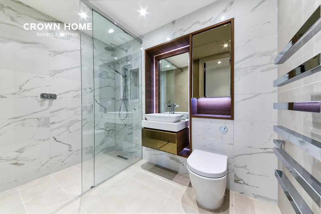 Both bedrooms are generously sized and feature floor-to-ceiling windows that allow for ample natural light. Built-in wardrobes provide seamless storage, while the layout ensures maximum comfort and style. The apartment includes two modern bathrooms with polished chrome fittings, large-format porcelain tiles, and a walk-in shower or bathtub, delivering a luxurious, spa-like experience. A convenient additional cloakroom adds functionality to the space.