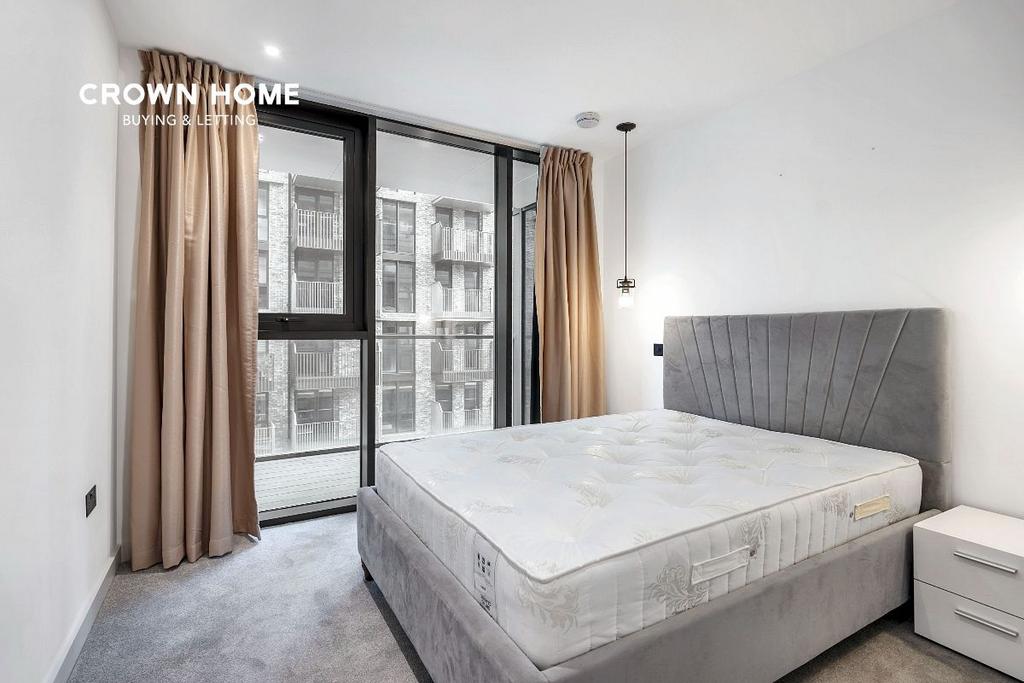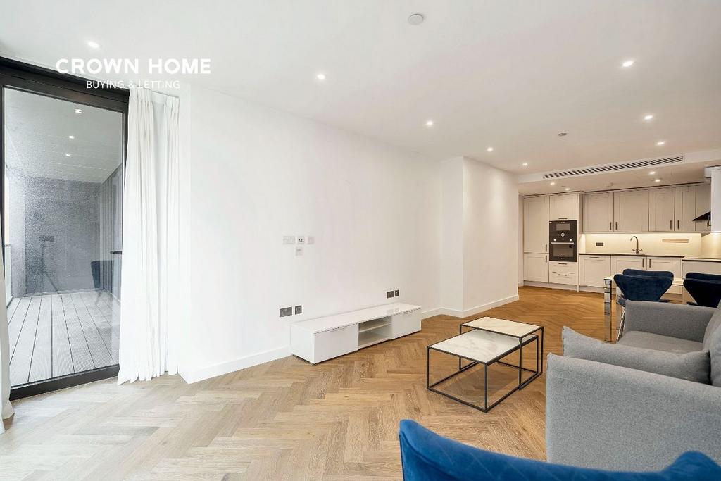 This apartment in London Dock offers a spacious living and dining area with elegant timber herringbone flooring and access to a terrace overlooking the communal garden. The fully equipped L-shaped kitchen features modern Bosch appliances, a bronze splashback, wine cooler, and composite stone worktops. Ample storage, comfort cooling, and a washer/dryer enhance convenience.