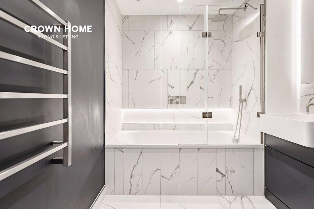 This impeccably designed apartment, nestled in a vibrant London neighbourhood, exudes warmth with its spacious, light-filled living and dining area. The fully-equipped kitchen is perfect for cooking enthusiasts, while ample storage and excellent lighting enhance the apartment's appeal. The balcony offers a peaceful escape, ideal for relaxation. Stylish bedrooms feature floor-to-ceiling windows and custom-fitted wardrobes, creating a perfect retreat. The marble-clad bathrooms, with a sleek walk-in shower and spacious tub, provide a luxurious space to unwind.