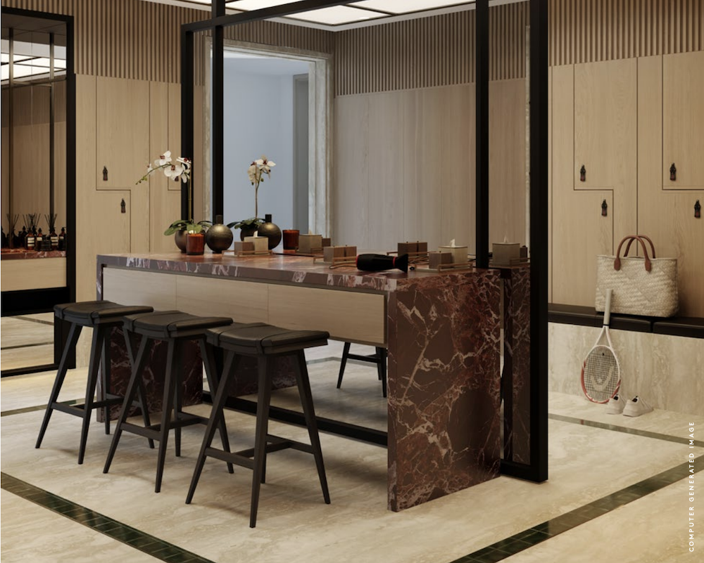 Residents have exclusive access to a luxurious range of amenities located across the lower ground floors. These include a lobby and reception area, a sports hall for various activities, a state-of-the-art gym, a 25-meter swimming pool, a hydro pool, fitness studio, spa treatment rooms, experience showers, saunas, steam rooms, a club lounge, TV lounge, and changing rooms.