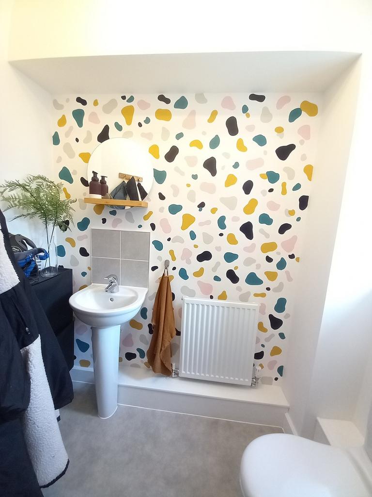 FITTED CLOAKROOM 6’ 5” (1.95m) x 3’ 7” (1.11m) having a white suite comprising a pedestal wash hand basin with a tiled splash back and a WC low suite, vinyl flooring, a single radiator, coat hooks, a wall mirror/shelf, a uPVC double glazed window, an Xpelair timed automatic extractor fan and a wood effect door.
