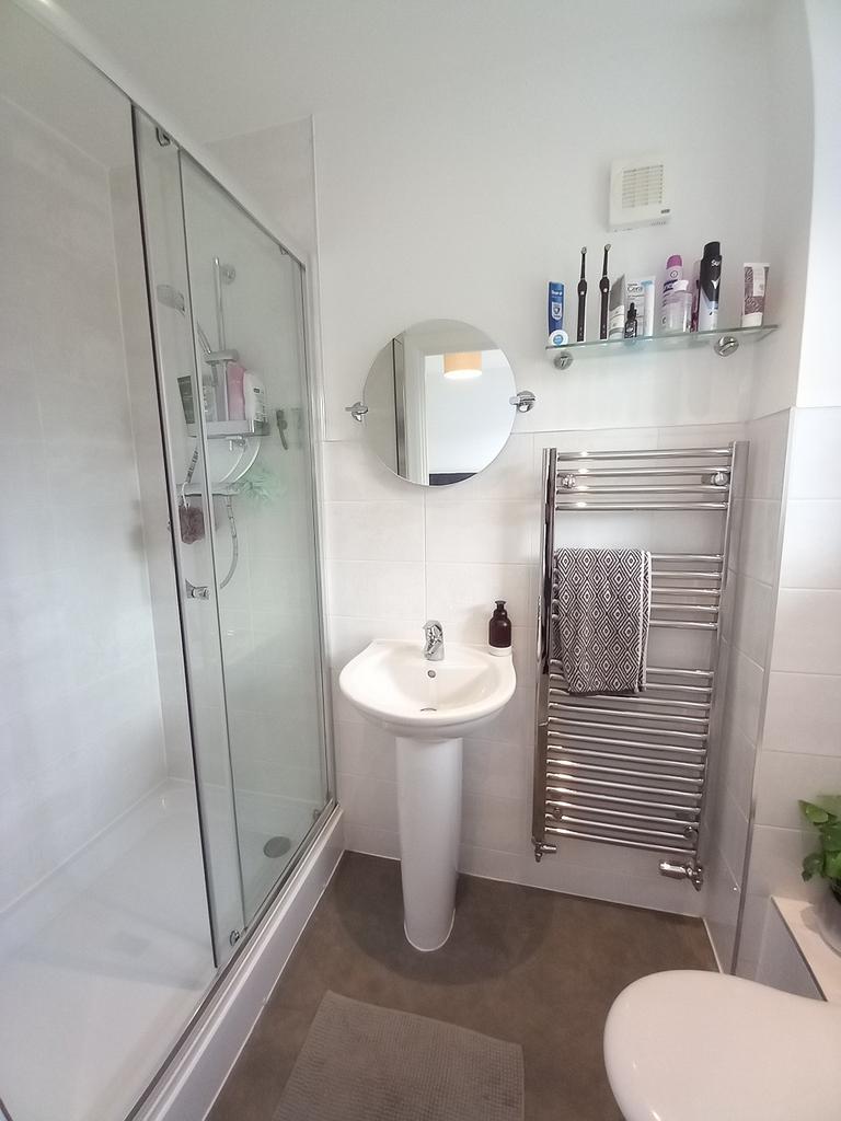EN-SUITE SHOWER ROOM 7’ 6” (2.30m) x 3’ 9” (1.16m) having a white suite comprising a tiled/glazed shower cubicle with a glazed sliding entrance door, a pedestal wash hand basin and a WC low suite. Vinyl flooring, a ‘ladder’ style heated towel rail, a wall mirror, a uPVC double glazed window, an extractor fan, a wood effect panelled door and three recessed ceiling downlighters.