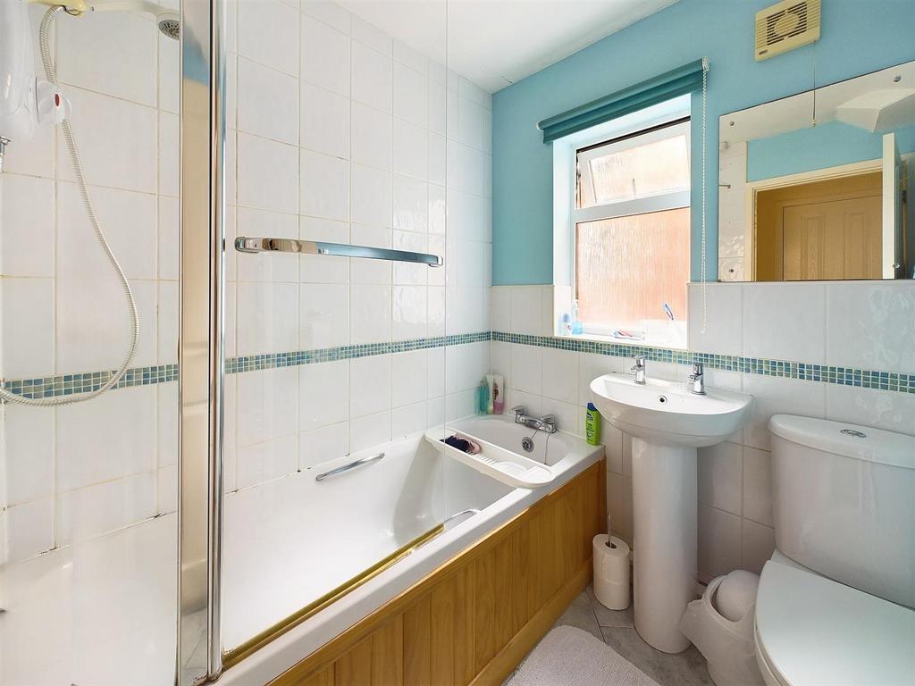 Bathroom - 1.75m x 1.73m (5'9 x 5'8) - Upvc frosted double glazed window to side, panelled bath with shower over, low level wc & pedestal wash hand basin, partly tiled walls, heated towel rail, tiled flooring.