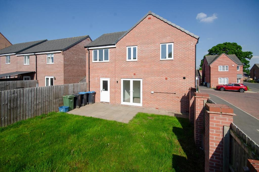 The enclosed rear garden features a paved seating area and is predominantly laid to lawn.
