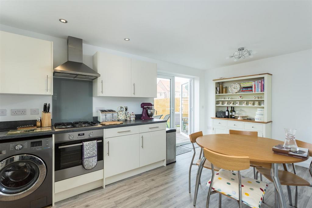 Inside - A reception hall with cloakroom/wc and staircase rising to the first floor leads off into a 17'4" (5.28m) long living room with walk-in bay window and an attractively appointed 17'4" (5.28m) long dining kitchen with double doors off the dining area out into the rear garden, granite effect worktops with inset one and a quarter bowl sink unit plus a range of base and wall storage cupboards, complemented by freestanding appliance space and an integrated gas hob and an electric fan assisted oven and grill under