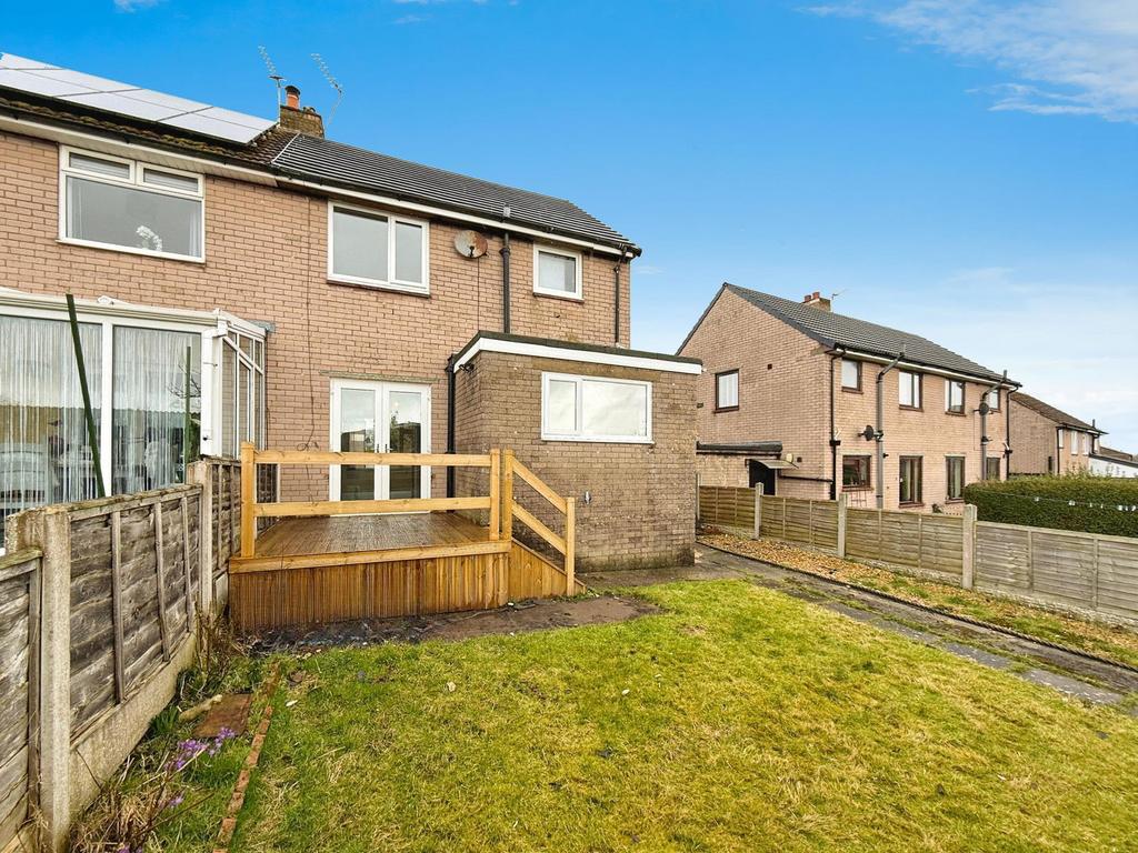 The lawned rear garden is perfect for children to play or for gardening enthusiasts. A patio area and the raised decking section are ideal for outdoor dining, BBQs, and relaxing in the sun.